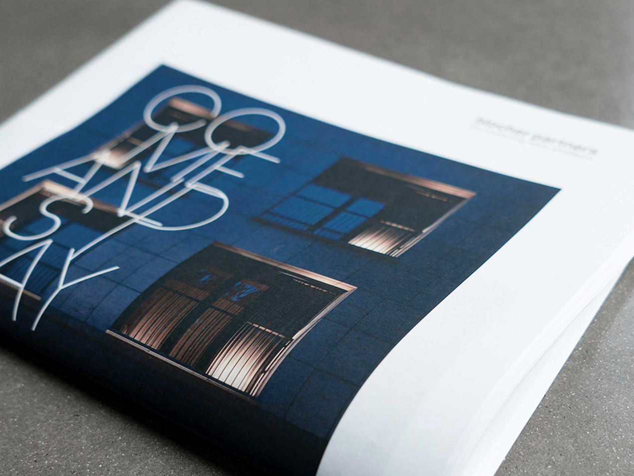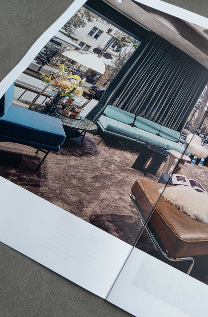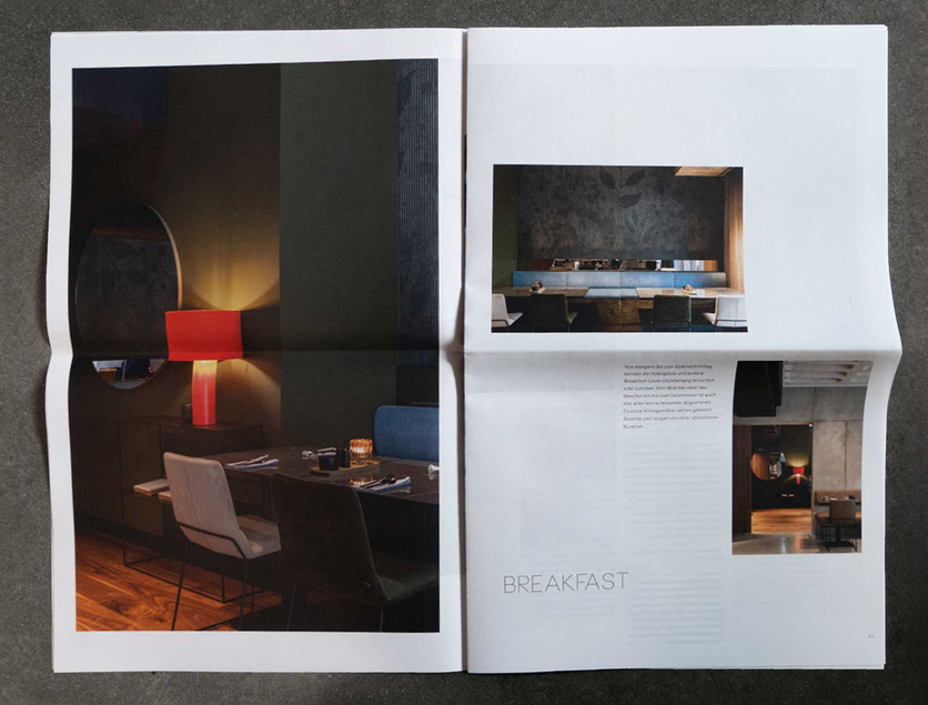 The layout is characterised by an airy design and typography with soft fading, which creates a modern and sophisticated aesthetic. An open and reduced layout ensures a pleasant reading experience. High-quality uncoated paper lends the design-orientated print product a cool understatement – carefully tailored to the mid-century style of the hotel.