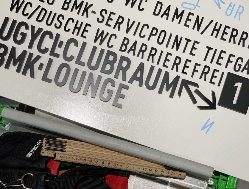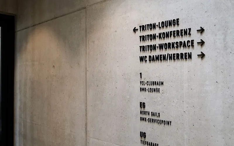 The timeless yet modern wayfinding system that the communication experts at typenraum developed for the premises emphasises the exclusive ambience of the marina. It relies on a delicate typographic solution with 3D letters made of Corian, which fully unfold their subtle effect in combination with the exposed concrete walls. The sans serif font blends discreetly into the purist architecture. The signage system helps visitors to find their way around effortlessly. Another element that emphasises the service concept of the marina.