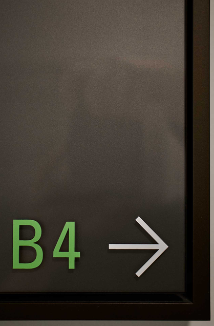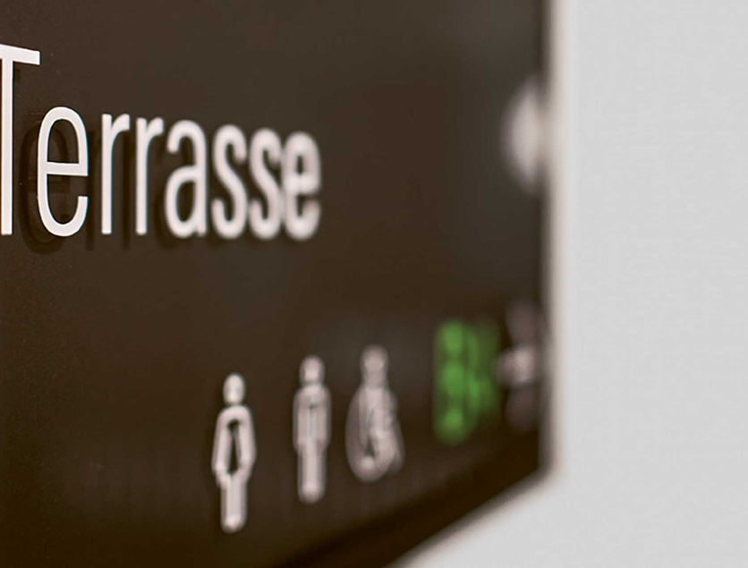 Zwei wiederkehrende Elemente prägen das Design: Ein feiner, umlaufender Aluminium-Rahmen in Eloxal-Optik vermittelt den Eindruck, als ob die Inhalte schweben würden. Die Acrylglas-Tafeln sind von hinten mit einem dunklen Metallic-Ton lackiert und von vorne grafisch bespielt, wodurch der Effekt räumlicher Tiefe entsteht. Nicht sichtbare Befestigungen unterstreichen die leichte, filigrane Wirkung.