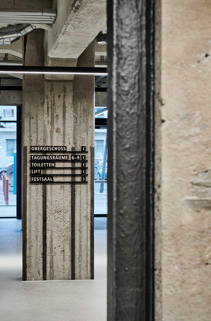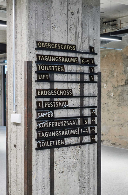 Das neue Leitsystem reflektiert die Ästhetik der Umgebung und zeichnet sich durch eine raffinierte Kombination aus roughen Elementen im Industrial Style sowie hochwertigen Materialien aus; rauchig glänzende Acrylplatten verleihen ihm eine einzigartige Optik. Eine klare Etagenübersicht sorgt für einfache Orientierung, während die integrierte Nummerierung in der Holzverkleidung der Türen eine elegante Einbindung des Leitsystems in die Architektur gewährleistet.