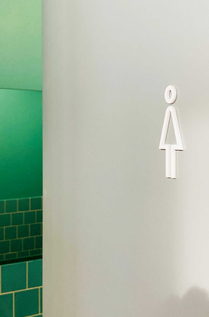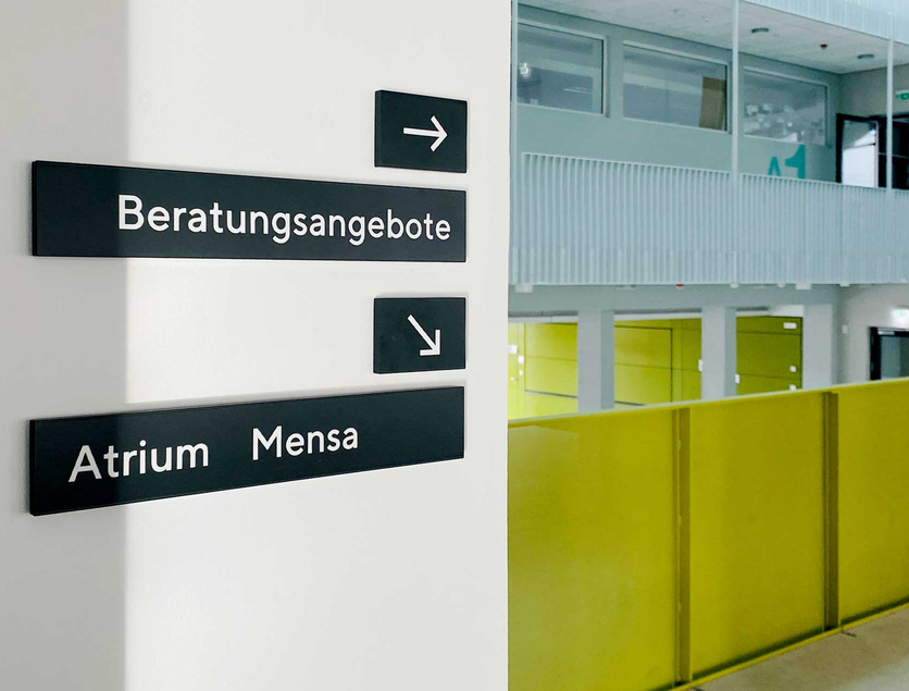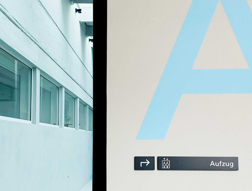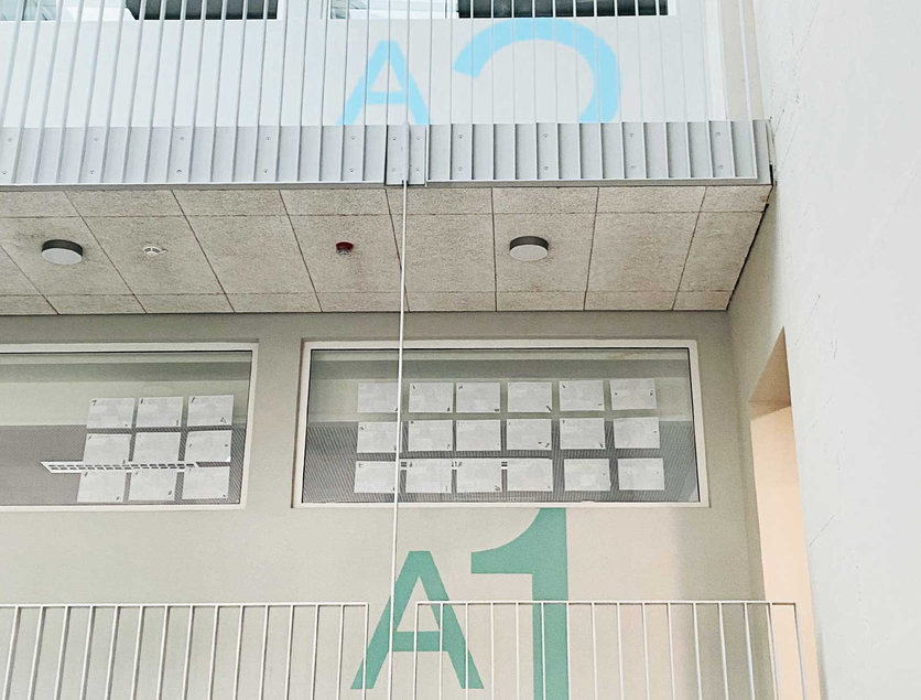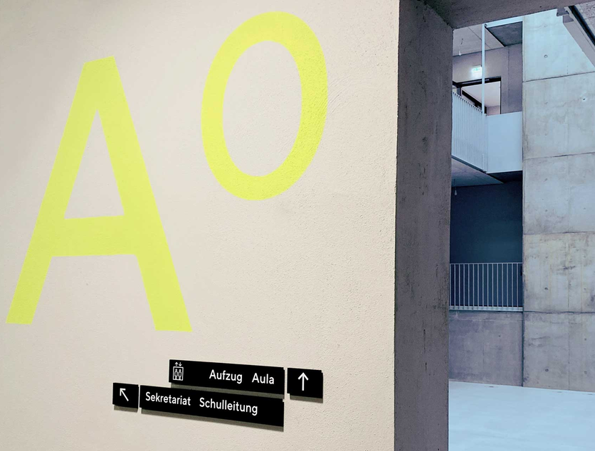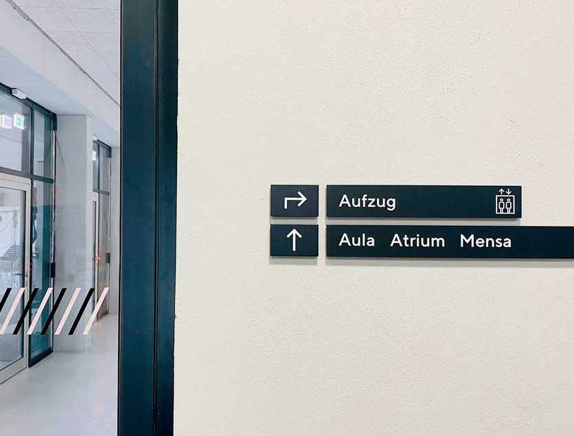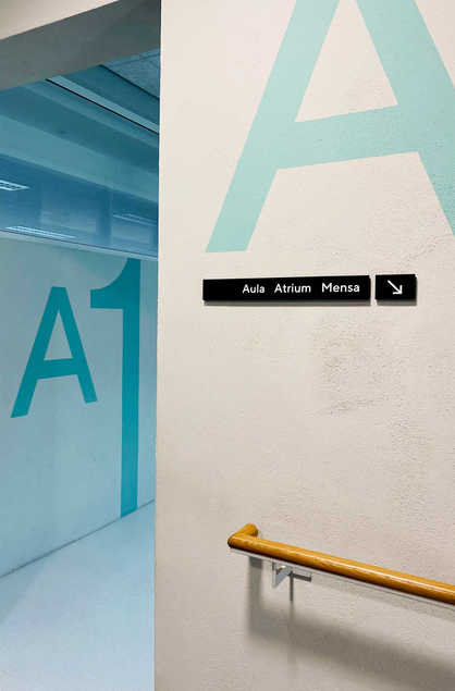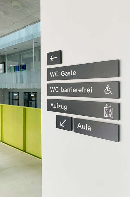 Die Gestaltung des Leitsystems ist bewusst einfach und plakativ gehalten, mit neutralen Tafeln im selben dunklen Ton wie die Türen der Schule. Unsichtbare Befestigungen lassen sie leicht und unaufdringlich wirken. Die Wegweiser bilden einen Kontrast zur großen farbigen Nummerierung der Etagen, die als Malerarbeit direkt auf die Wände gebracht wurde. Das durchdachte Leitsystem sorgt für kurze Wege in die Räumlichkeiten und trägt so zu einem modernen Lernumfeld bei.