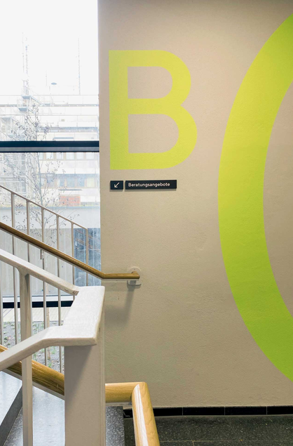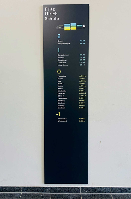Im Zuge der Sanierung und Modernisierung der Fritz-Ulrich-Schule in Heilbronn wurde ein neues Leitsystem implementiert, das sich aus der Gebäudestruktur und Innenarchitektur herleitet, sowie am übergeordneten Farbkonzept orientiert: Ein Farbverlauf von Gelb über helle Grüntöne zu Himmelblau zieht sich – auch von weitem gut sichtbar – durch die Gebäude.