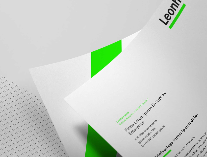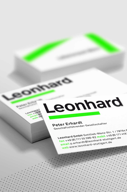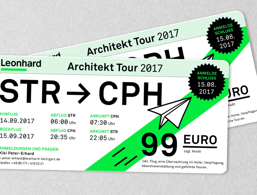 Ebenfalls von typenraum entwickelt wurde die neue Präsentationsvorlage, die sowohl intern als auch extern – beispielsweise bei Kundenpräsentationen – von Leonhard genutzt wird. Auch Eventeinladungen entwarfen die Gestalter, beispielsweise die Einladungskarte im Look einer Boarding-Karte für die von Leonhard organisierte „Architekt Tour“ nach Kopenhagen. Das Design dieser Einladung nutzt neben dem Corporate Design die der Art der Reise und greift zusätzlich die Nähe des Unternehmens zum Stuttgarter Flughafen auf. So entstand – ausgehend von der Inspiration eines neongrünen Textmarkers – ein komplettes Corporate Design, das die Marke Leonhard auf vielfältige Weise transportiert.