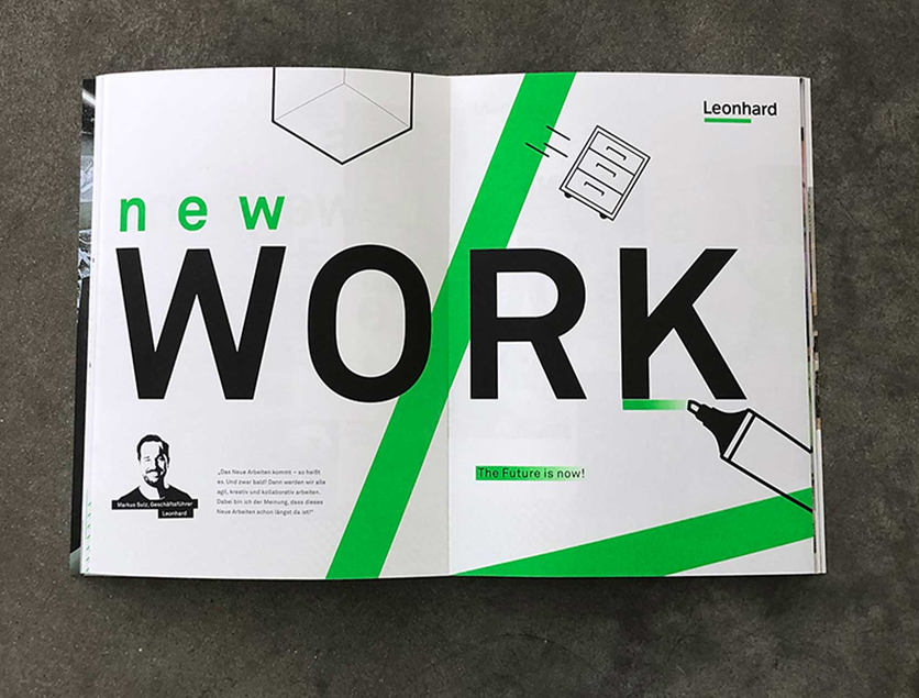 Arbeitswelten 4.0, Coworking, Design Thinking – Innovationsprozesse beginnen bei der Raumplanung, weiß die Leonhard GmbH, einer der innovativsten Büro- und Objekteinrichter und Fachplaner für Arbeitswelten. Entsprechend wurde auch das eigene Erscheinungsbild hinterfragt. Das neue Corporate Design baut auf den Inhalt des Claims »Lebensraum Büro«. Diesen Titel wird konsequenterweise auch das hauseigene periodische Magazin tragen – redaktionell und grafisch von typenraum mit Leben gefüllt.