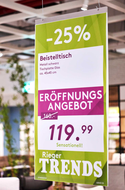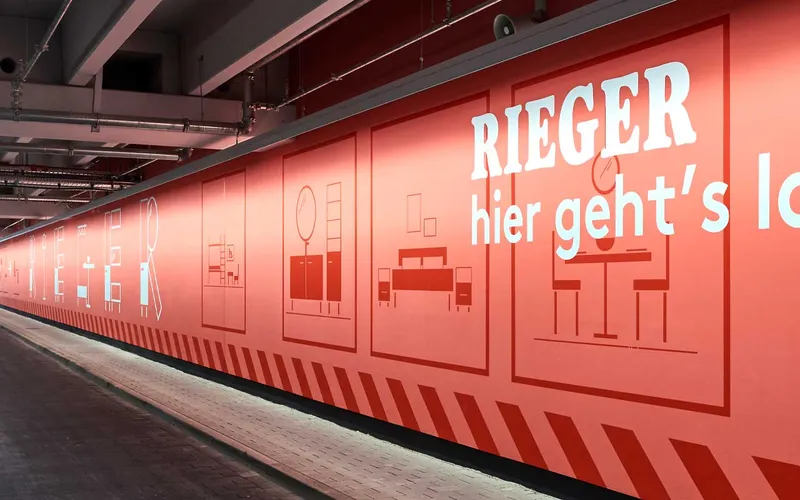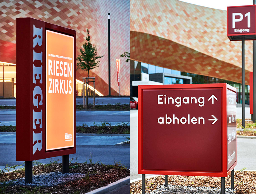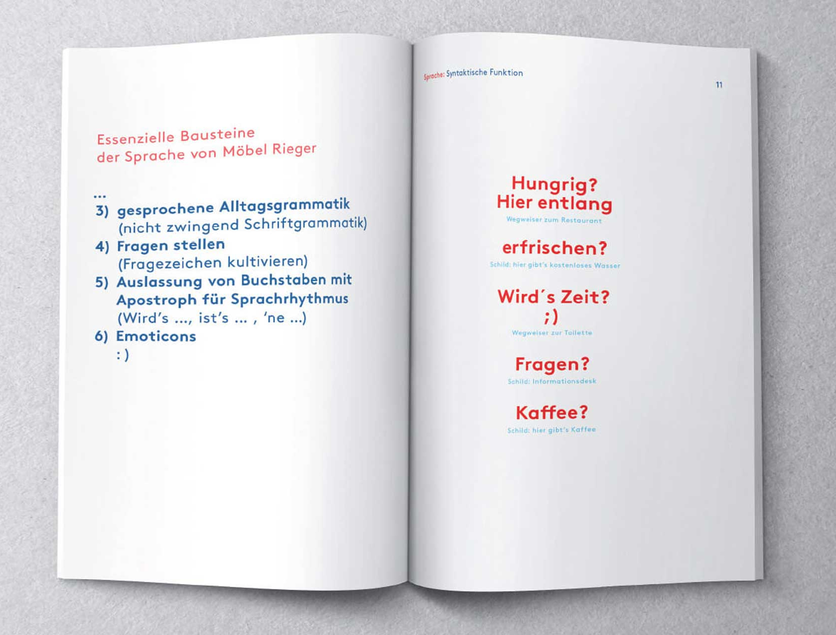 Auf Basis des von typenraum entworfenen Corporate Designs wurde eine Pressemitteilung zum Richtfest konzipiert, die in Form, Inhalt und Design vom Einheitsbrei abwich und für Aufmerksamkeit sorgte. Die Corporate-Publishing-Kompetenz kam bei der Erstellung einer achtseitigen Mitarbeiter-Akquisebroschüre zum Tragen – vom Konzept über die redaktionellen Inhalte bis hin zum Grafikdesign. Die Publishing-Zusammenarbeit wurde mit einer Imagebroschüre fortgesetzt. Die Vielseitigkeit der Agenturausrichtung zeigte sich bei der Konzeption und Erstellung von digitalen Bandenwerbung für die Spielstätte des VfB Stuttgart, dessen Clubpartner Möbel Rieger mit »Heimvorteil« in Szene gesetzt wird. Im Vorfeld der Eröffnung des Möbelhauses wiesen Busse in Heilbronn auf die Neueröffnung hin, die Bespielung entstammt ebenfalls der Kreativdirektion von typenraum. Für Präsenz in den Medien sorgte eine Pressekampagne, die größere und kleinere Impulse konzertiert vereinte.