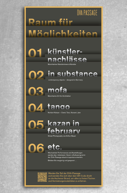 Architektur und Corporate Design akzentuieren den 50er-Jahre Charme der Passage unter Berücksichtigung des Denkmalschutzes und eines restauratorischen Gutachtens. Die oberen Geschosse des Gebäudes wurden umgebaut, das Nutzungskonzept umfasst nun neben Gewerbeflächen auch Büro- und Wohneinheiten. Die Fassade erstrahlt wieder in ihrem Originalzustand. Im Zuge der Neugestaltung des Corporate Designs entwickelte typenraum ein visuelles Kommunikationskonzept für ein »Interimsevent«, bei dem lokale Künstler und Start-ups die Passage vor ihrer Neueröffnung zum Leben erweckten.